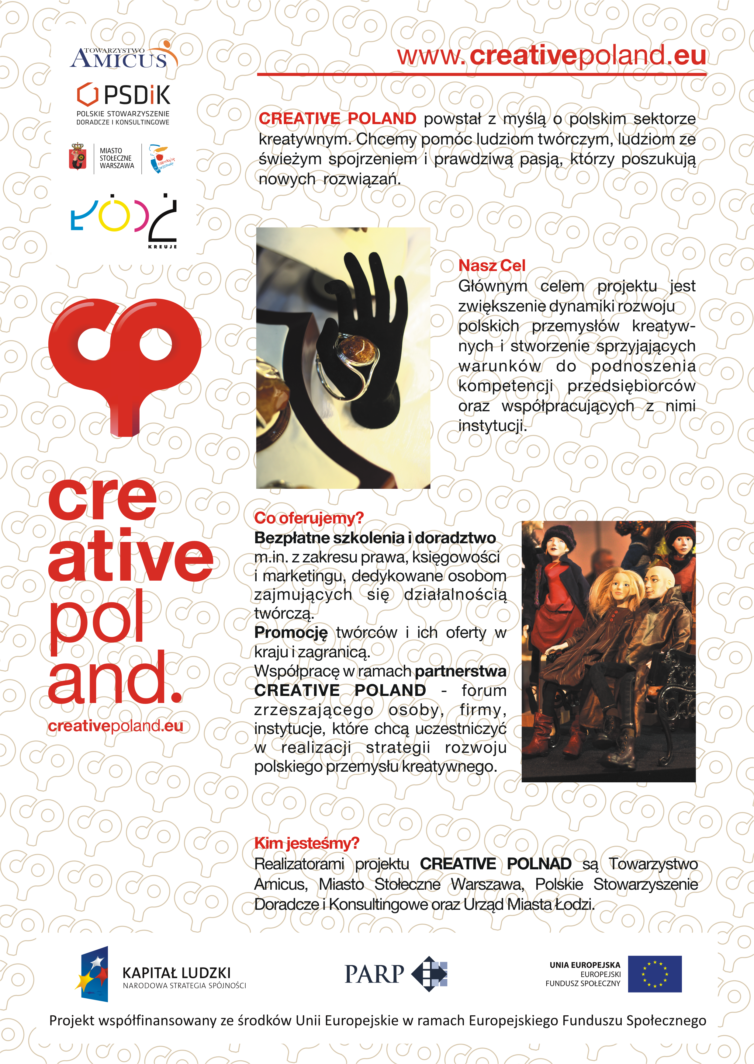 W ramach projektu CREATIVE POLAND Towarzystwo Amicus we współpracy z Polskim Stowarzyszeniem Doradczym i Konsultingowym, Urzędem m.st. Warszawy oraz Urzędem Miasta Łodzi organizuje bezpłatne, jednodniowe szkolenia dla przedstawicieli sektora kreatywnego (mogą wziąć udział zarówno twórcy jak i osoby, które działają na rzecz rozwoju poszczególnych dziedzin):